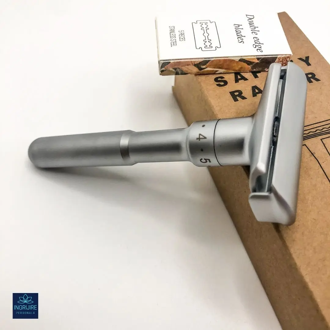 Aparat de ras clasic cu reglaj al unghiului lamei, aluminiu si otel inoxidabil.