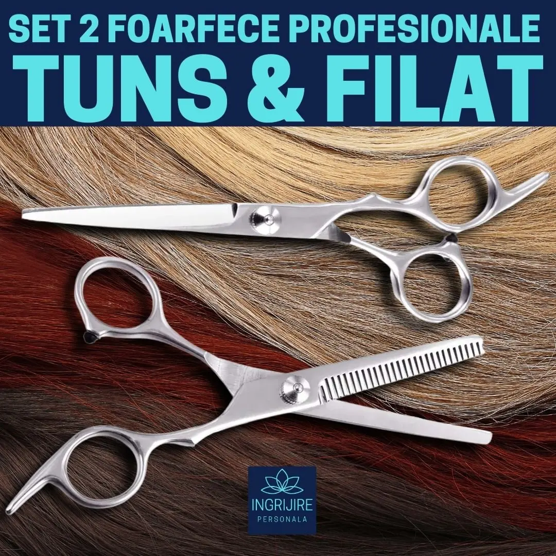 2 foarfece profesionale (tuns + filat) din oțel inoxidabil.