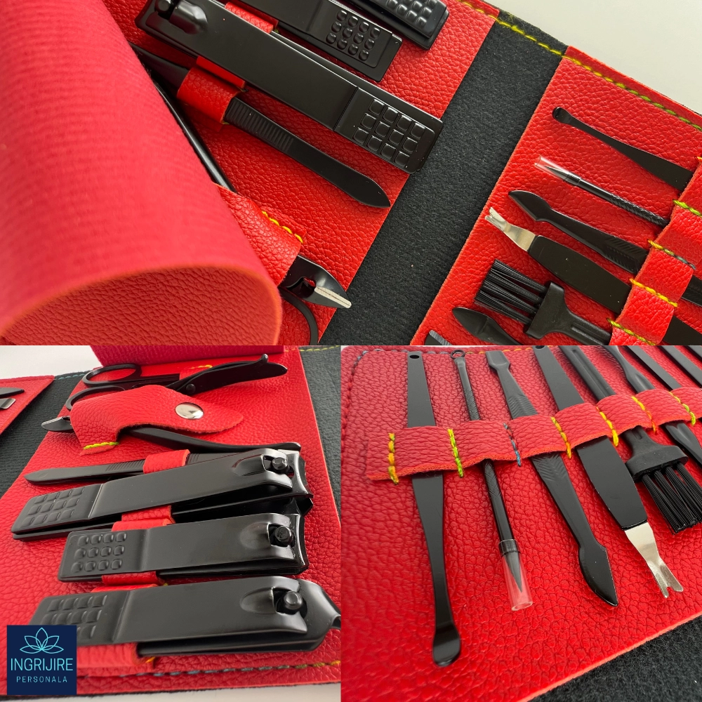 Trusa manichiura 16 piese, otel negru mat, etui din piele ecologica rosie