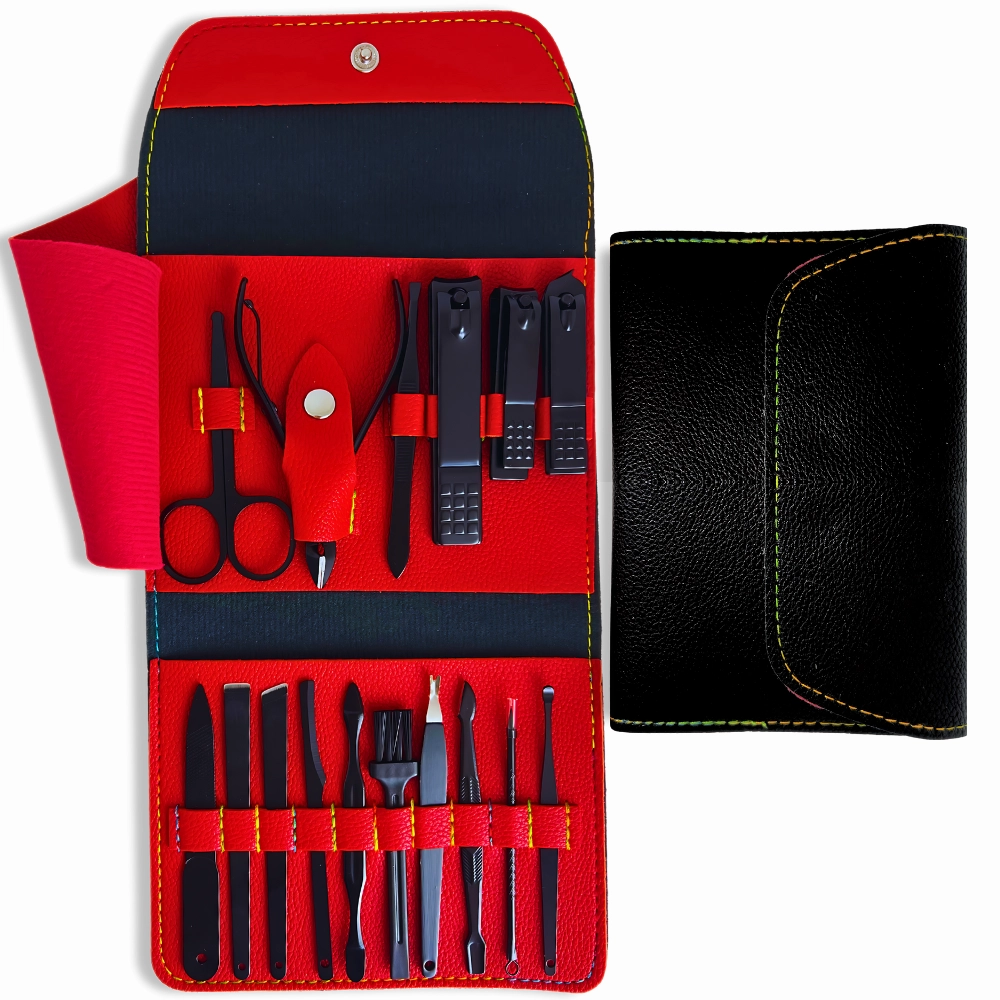 Trusă Manichiură Profesională – 16 Piese, Oțel Negru Mat, Carcasă Piele Ecologică Rosie