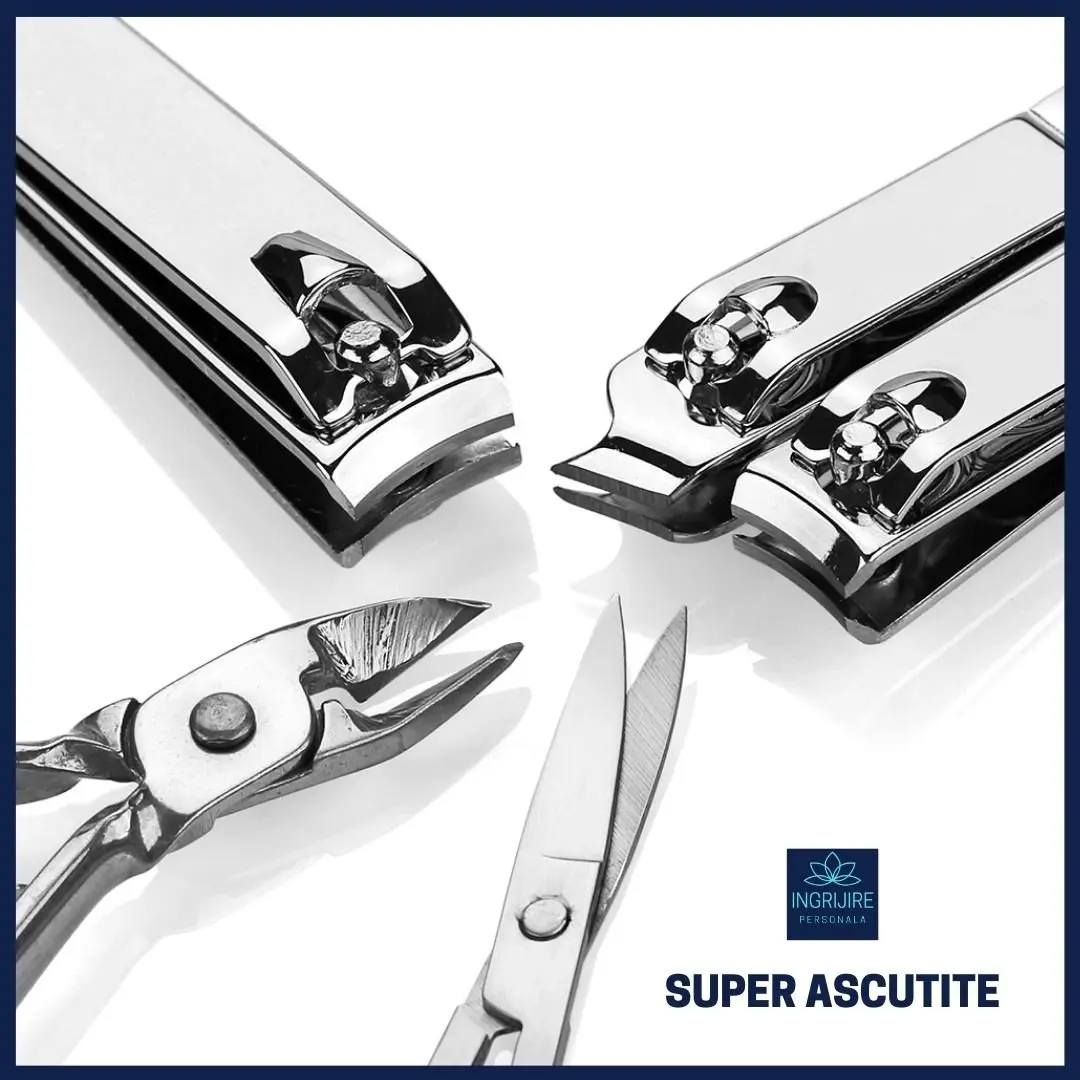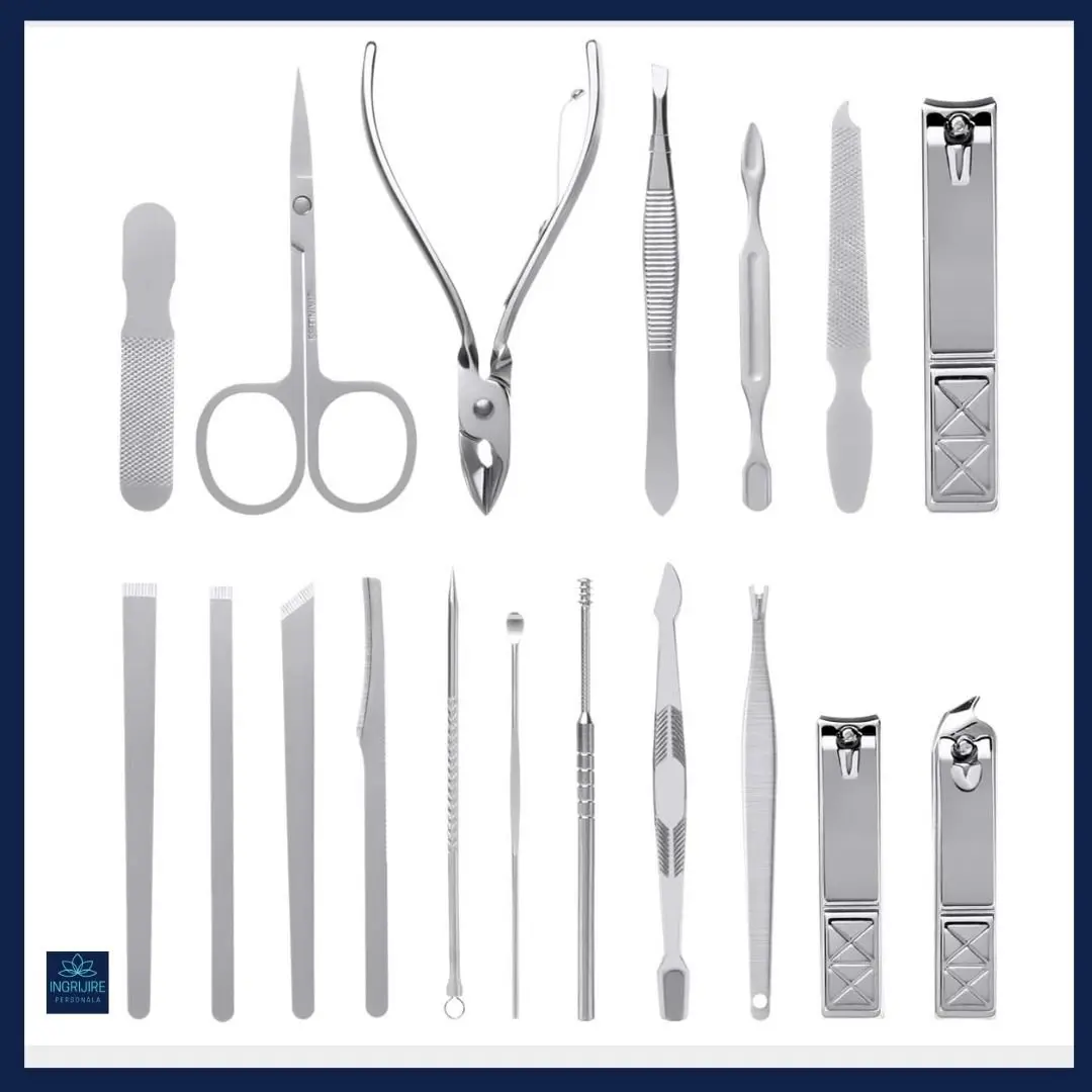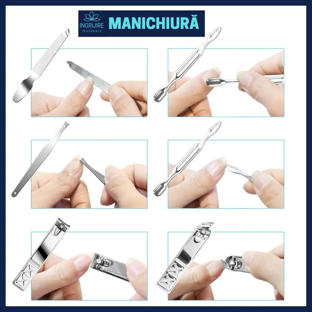 Continut: 2 x Pila, 1 x Unghiera mica pentru colturi, 1 x Bisturiu pentru indepartarea cuticulelor, 1 unghiera mica pentru unghiile de la maini, 1 unghiera mare pentru unghiile de la picioare, 2 x Curatitor urechi, 1 x Penseta, 1 x forfecuta sprancene, 2 x Bisturiu pentru impingerea inapoi a cuticulelor, 2 x Bisturiu de manichiura dublu, 4 x Cutit cuticule