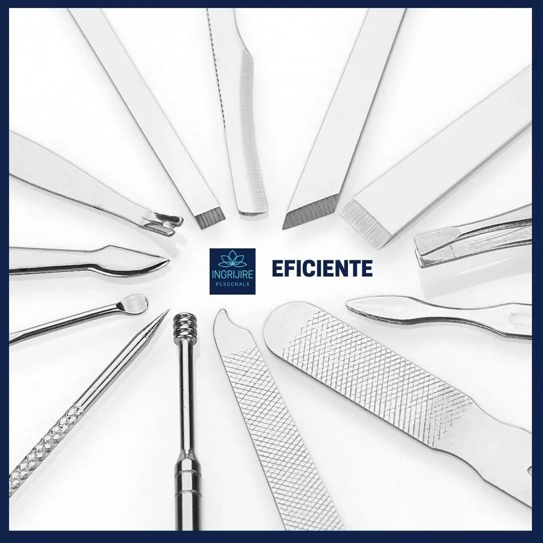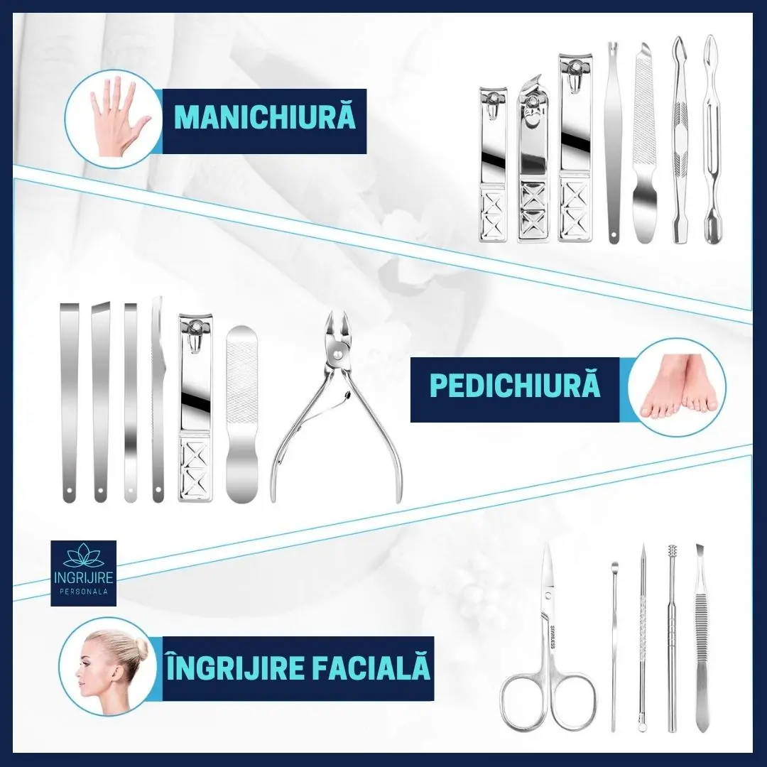 • Conține 18 instrumente premium pentru manichiură, pedichiură și îngrijire facială