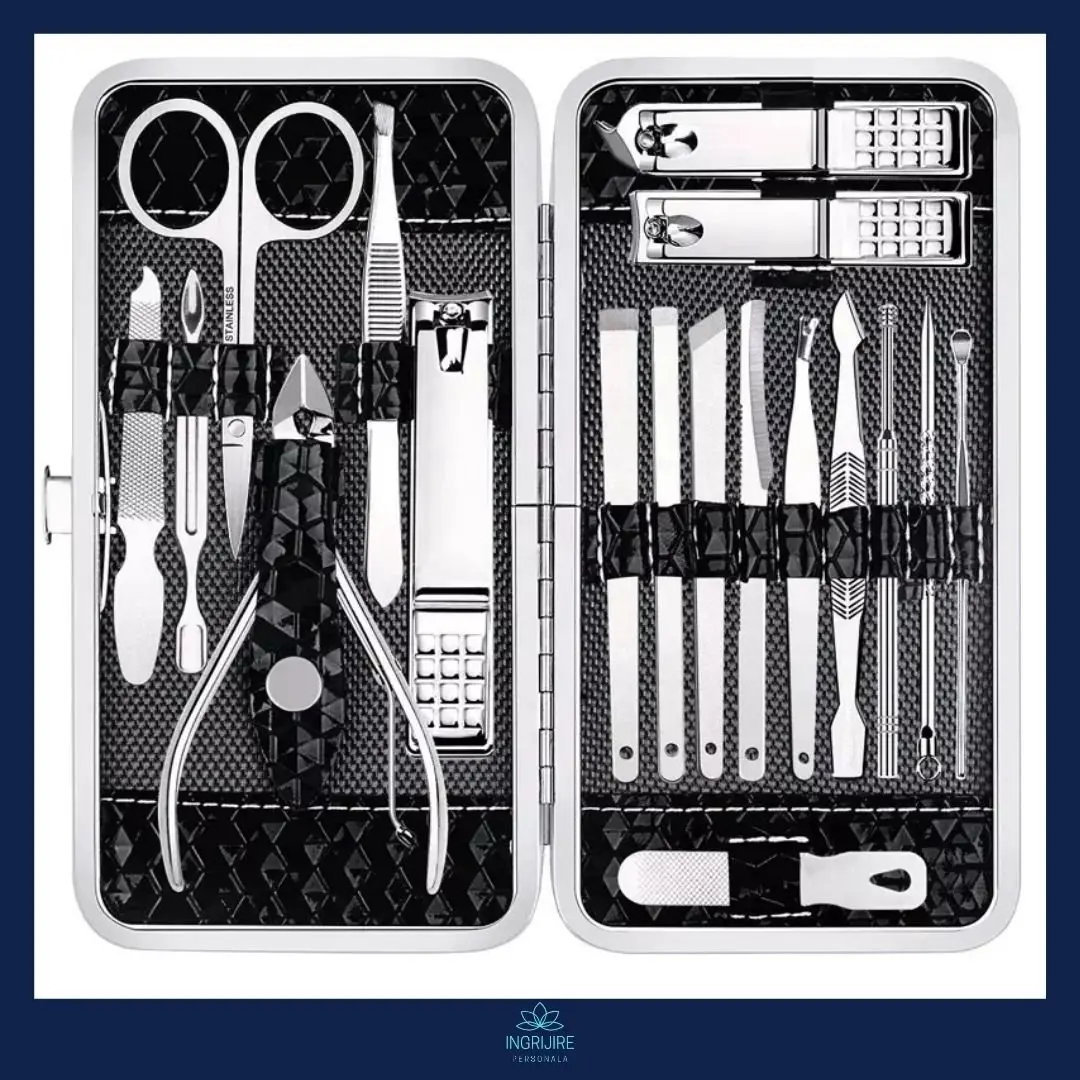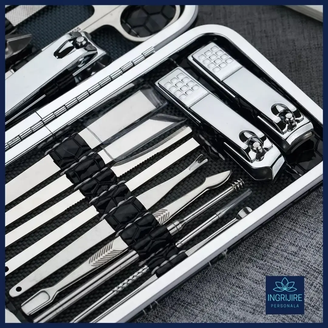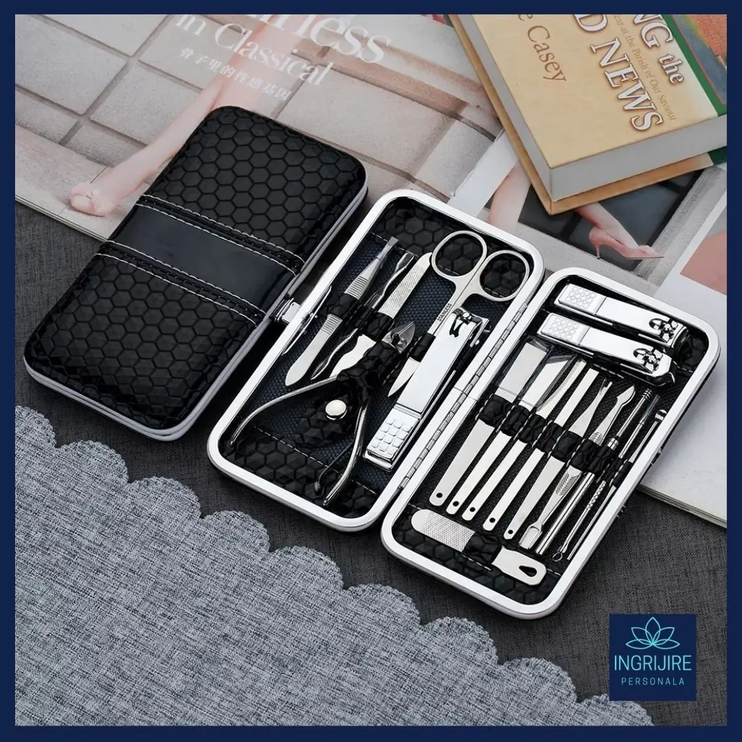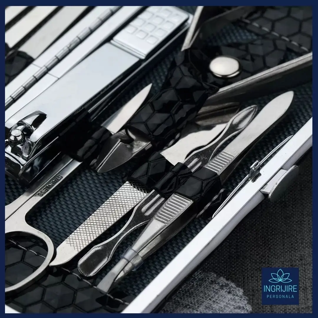 Continut: 2 x Pila, 1 x Unghiera mica pentru colturi, 1 x Bisturiu pentru indepartarea cuticulelor, 1 unghiera mica pentru unghiile de la maini, 1 unghiera mare pentru unghiile de la picioare, 2 x Curatitor urechi, 1 x Penseta, 1 x forfecuta sprancene, 2 x Bisturiu pentru impingerea inapoi a cuticulelor, 2 x Bisturiu de manichiura dublu, 4 x Cutit cuticule