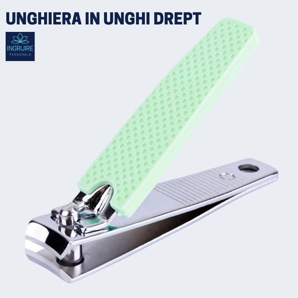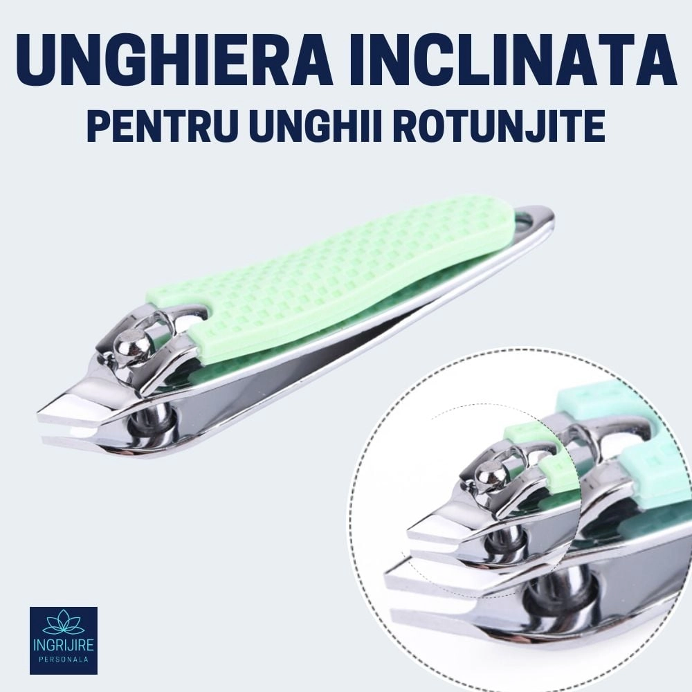 Kit format din doua unghiere in cu varfuri in unghi drept si inclinat pentru realizarea manichiurii atat pentru unghii rotunjite cat si pentru unghii drepte si o pila cu suprafata abraziva pentru finisajul perfect.